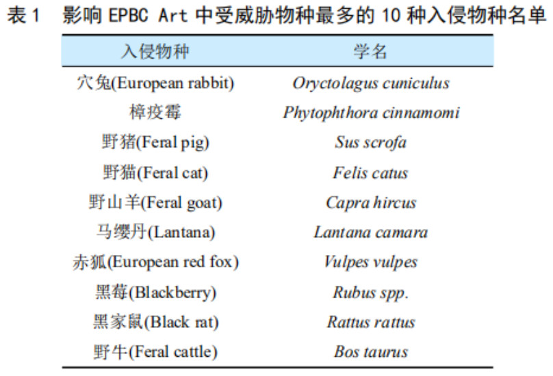 研究表明,1999年澳大利亞《環境保護和生物多樣性保護法》所列正在受到威脅或已經瀕危的1770種物種中有1257種受到入侵物種的影響。澳大利亞共有267種入侵物種(207種植物,57種動物和3種病原體)被列入影響EPBC Art中受威脅物種的有害生物黑名單,其中包括230種非本地物種(187種植物、41種動物和2種病原體)和37種有問題的本地物種(20種動物、16種植物和1種病原體)。影響力(影響物種數量)最大的前10種入侵物種中有7種為哺乳動物(表1)。