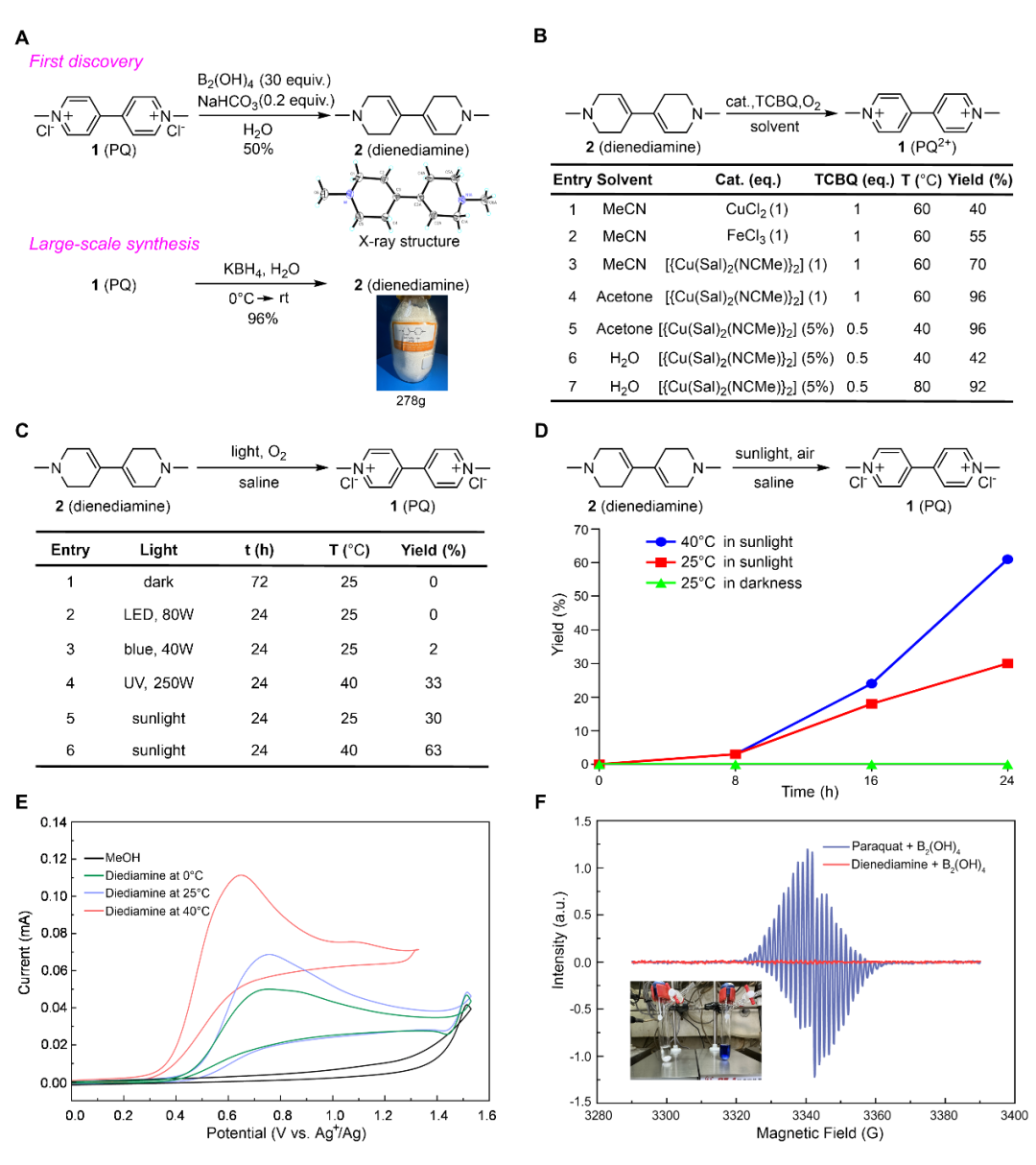 研究團隊實現了1,1'-二甲基-1,1',2,2',3,3',6,6'-八氫-4,4'-聯吡啶的簡潔合成,通過X射線單晶衍射確定其結構,并將其命名為雙烯雙胺。利用硼氫化鉀和水作為反應條件可實現雙烯雙胺的百克級規模制備。在研究雙烯雙胺轉化為百草枯的過程中,研究人員發現采用[{Cu(Sal)2(NCMe)}2]作為催化劑,四氯苯醌或氧氣作為氧化劑時,雙烯雙胺能在水或丙酮中以較高收率轉化為百草枯。研究團隊驚奇地發現,雙烯雙胺在一定溫度的鹽水中,空氣和自然光照條件下, 仍然以63%的收率轉化為百草枯(圖2)。