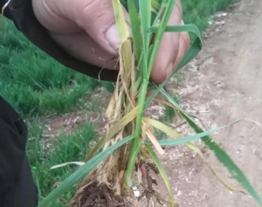 2、前茬作物秸稈不規范還田造成“吊根苗”引起發黃。小麥黃根多,白根少,植株因得不到足夠的水分和養分,再加上強寒潮的侵襲,造成麥苗發黃。這種發黃,往往是心葉稍輕,老葉更黃;在田間是一行一片的,或一窩一塊的,分布不均勻。