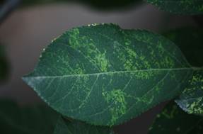 •斑駁型:病葉上出現(xiàn)大小不等、形狀不定、邊緣清晰的鮮黃色病斑,后期病斑處常常枯死。在一年中,這種病斑出現(xiàn)最早,而且是花葉病中最常見(jiàn)的癥狀。