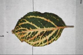 •條斑型:病葉沿葉脈失綠黃化,并延及附近的葉肉組織。有時(shí)沿主脈及支脈發(fā)生黃化,變化分較寬;有時(shí)主脈、支脈、小脈都呈現(xiàn)較窄的黃化,使整葉呈網(wǎng)紋狀。