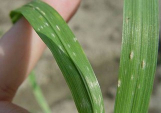 危害癥狀:小麥白粉病主要危害葉片,最初在葉面形成分散的白色絲狀霉斑,逐漸擴(kuò)大聯(lián)合呈橢圓形霉玨,嚴(yán)重時(shí)可覆蓋葉面大部或全部,霉層厚度1毫米左右,初為白粉狀,后變?yōu)榛疑?,至褐灰色。受害葉面早期變黃、發(fā)枯,病株矮小,重者不能成穗。該病可侵害小麥植株地上部各器官,但以葉片和葉鞘為主,發(fā)病重時(shí)穎殼和芒也可受害。初發(fā)病時(shí),葉面出現(xiàn)1~2mm的白色霉點(diǎn),后逐漸擴(kuò)大為近圓形至橢圓形白色霉斑,霉斑表面有一層白粉,遇有外力或振動立即飛散。這些粉狀物就是該菌的菌絲體和分生孢子。后期病部霉層變?yōu)榛野咨翜\褐色,病斑上散生有針頭大小的小黑粒點(diǎn),即病原菌的閉囊殼。