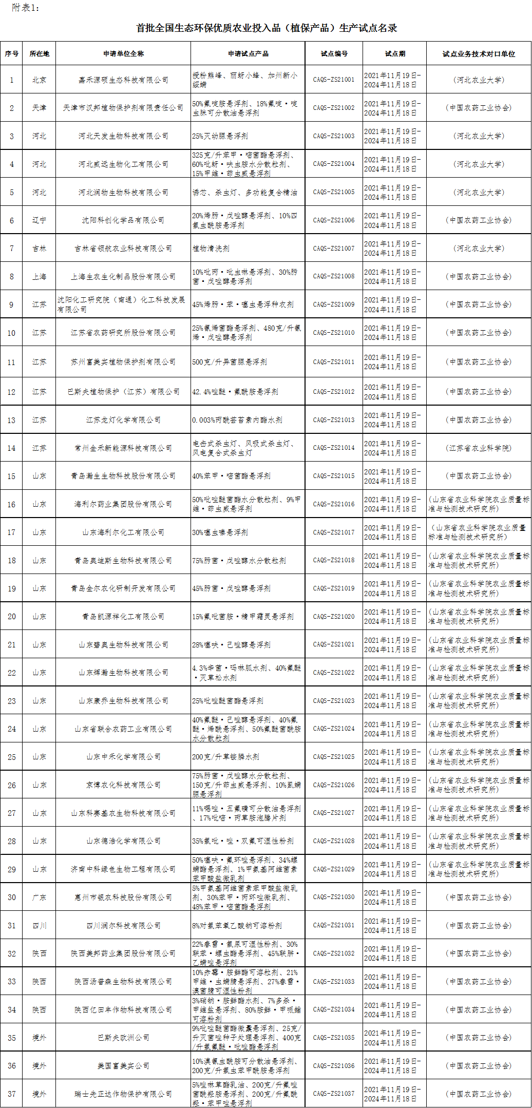 根據國家農安中心《關于提供生態環保優質農業投入品(植保用品)試點材料的函》(農質安(投)函〔2021〕129號)要求,由全國各農業投入品(植保產品)生產與應用單位自愿申請,經所在地(市、縣、區)及省級農產品質量安全與優質化工作機構審核推薦,國家農安中心組織專家技術評審和網上公示,確認將嘉禾源碩生態科技有限公司等37家植保產品生產單位納入首批全國生態環保優質農業投入品(植保產品)生產試點范圍,將北京市廣泰農場有限公司等17家植保產品應用單位納入首批全國生態環保優質農業投入品(植保產品)應用試點范圍(詳見附表),探索開展生態環保優質化試點,試點期3年。