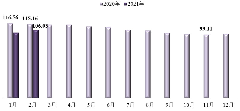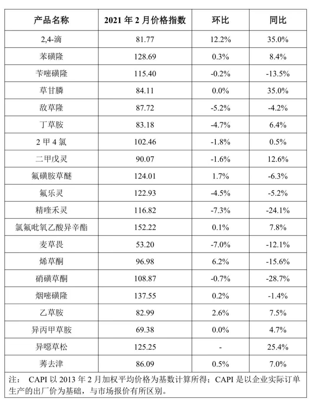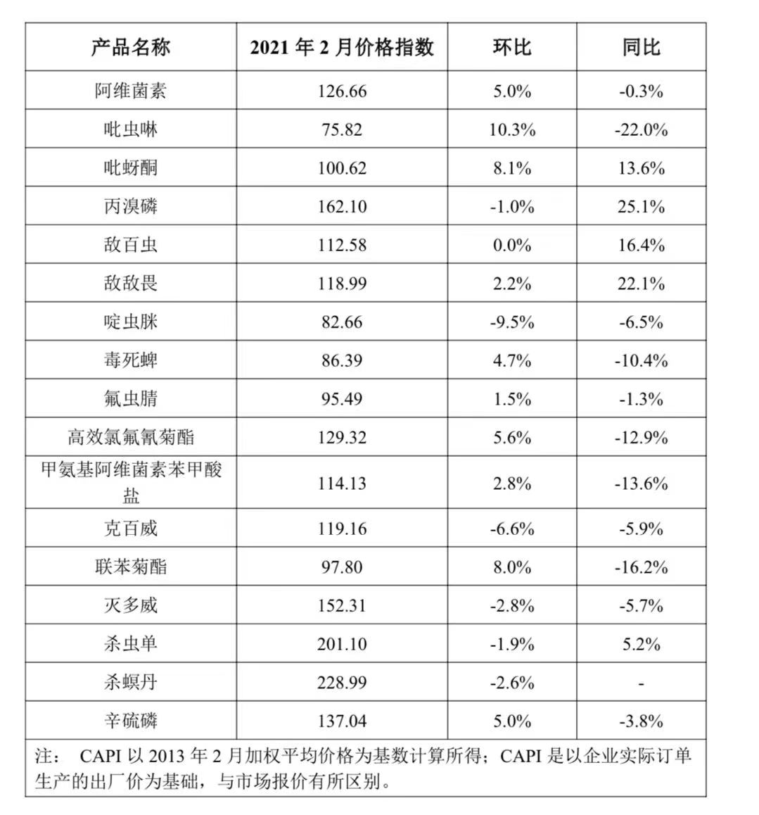 2021年2月,中國農藥價格指數(shù)繼續(xù)上揚。據中國農藥工業(yè)協(xié)會統(tǒng)計,2月農藥價格指數(shù)(CAPI)為93.10,環(huán)比上漲1.56%,同比上漲4.56%。