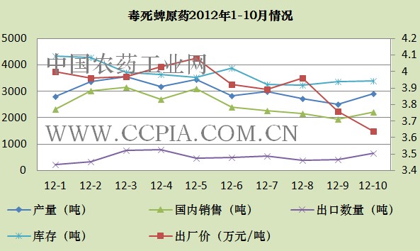 毒死蜱原藥10月份開工企業數保持穩定,產量略漲15.46%,其中南京紅太陽產量上漲12.78%,江蘇豐山集團產量與9月持平,江蘇寶靈產量環比上漲34.27%。但較去年同期產量同比下降16.04%。 2012年殺蟲劑市場普遍看好,年初毒死蜱原藥價格也隨原材料價格上漲而水漲船高,但較其他殺蟲劑產品來說毒死蜱漲幅小,價格于5月開始下滑,10月份價格下滑到2012年的最低點,出廠價僅為3.64萬元/噸,同比下降1.89%。庫存較豐富,但下游部分企業持觀望態度,市場成交量略漲,環比上升13.81%,冬儲市場方面成交量并不多。 10月份自營出口量增長58.05%,近幾年來,毒死蜱出口量和創匯高速增長,對提升市場價格也有一定推動作用。 庫存環比上升0.69%,同比下降17.74%。 企業信息:2011年, 利爾化學的毒死蜱原藥車間完成試生產并生產銷售了小批量產品,截止2012年9月30日,該車間廠房設備的賬面凈值為2533.62萬元,建成后尚未實現效益。2012年11月20日公告,審議通過了《關于對3000噸/年毒死蜱原藥車間設施進行變更的議案》。公司決定拆除位于綿陽本部的毒死蜱生產線,將其改造成公司現有主力產品的配套中間體生產設施。 本文作者:張慧 電話:010-84885067 郵箱:zhanghui@ccpia.com.cn 中國農藥工業網http://m.scwushuichulishebei.com獨家新聞,不得轉載。
