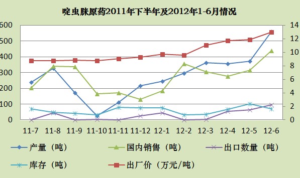 啶蟲脒原藥6月份總產量較去年同期大幅度上漲,2011年蟲害發生不嚴重,市場需求小,而2012年市場剛性需求強勁,同比近增產1.5倍。產量環比上升49.59%,其中山東省聯合農藥產量環比上漲近1倍,5月工信部批準山東省聯合農藥工業有限公司與泰安聯合生物化學科技有限公司進行資質合并,合并后的企業名稱為山東省聯合農藥工業有限公司,注冊資本2268萬元人民幣。據企業介紹,新煙堿類殺蟲劑吡蟲啉原藥因企業資質合并產能擴大,設計生產能力增加為3000噸,盡管啶蟲脒未擴產,但對其產量也有一定影響。