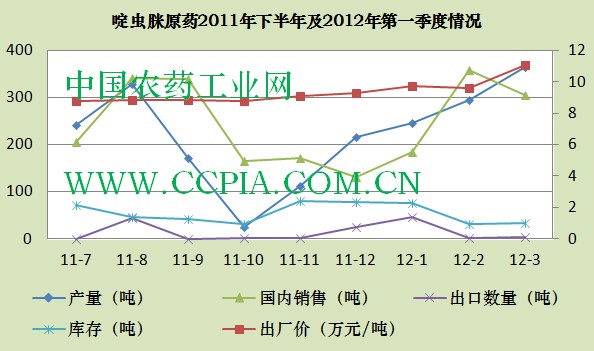 2011年冬季淡儲,貨源較為緊張,加上經銷商炒作,啶蟲咪原藥價格一路飆紅,市場均價為11.05萬元/噸。自營出口保持穩定,無大起伏。