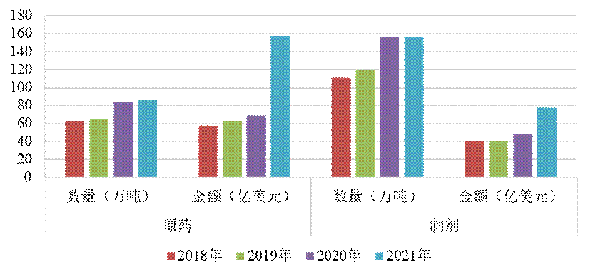 2  2018-2021年我國農藥原藥和制劑出口情況