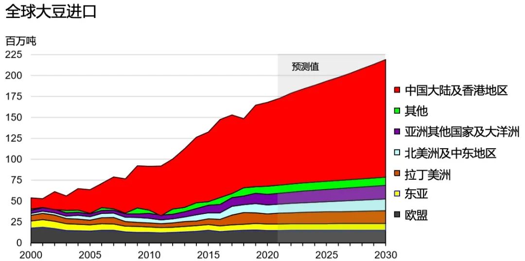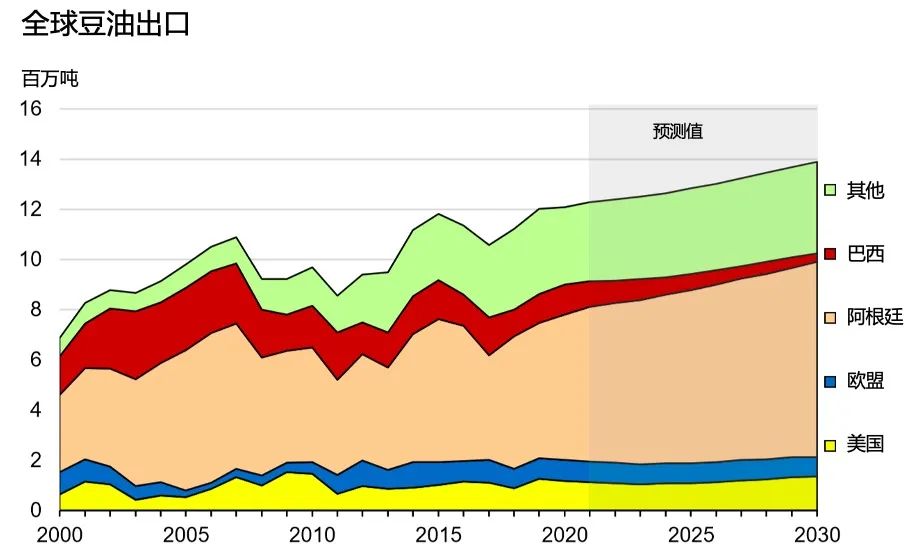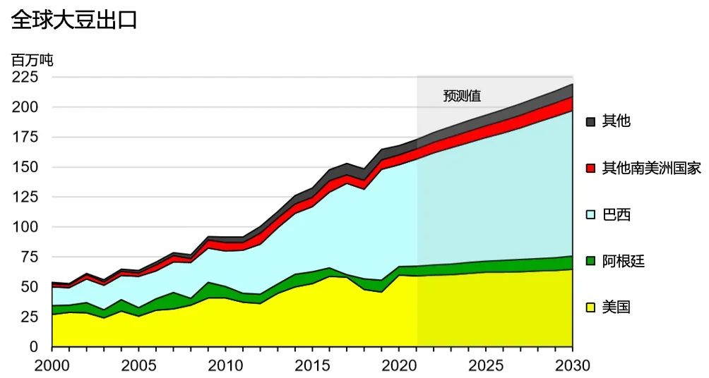 全球大豆出口則主要來自巴西、美國和阿根廷。到2030/31年,它們在全球大豆貿易中合計占比將接近90%。