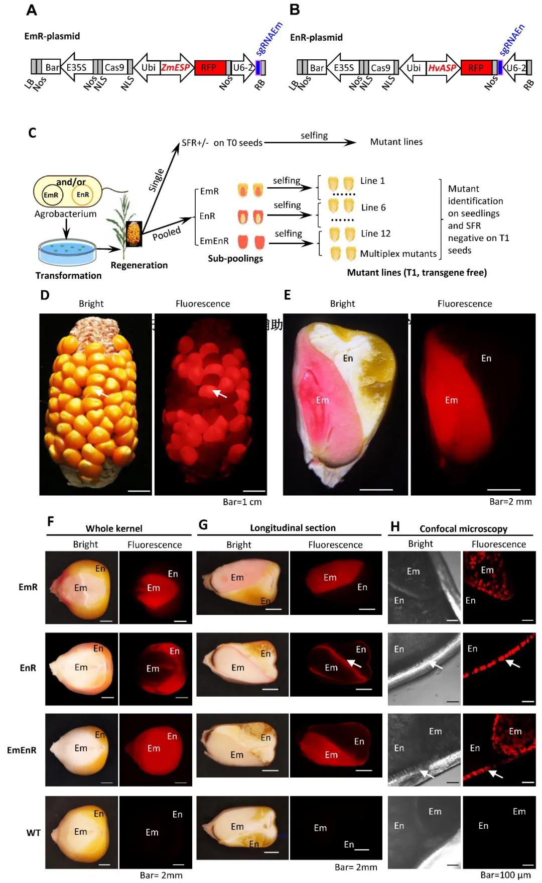 研究組分別采用胚乳糊粉層特異性啟動子(HvASP)和胚特異性啟動子(ZmESP)驅動紅色熒光蛋白DsRED的特異表達,構建了胚(Em-SFR/Cas9)、胚乳(En-SFR/Cas9)以及兩者混合構庫(Em/En-SFR/Cas9)熒光報告系統輔助CRISPR/Cas9,采用該系統對14個靶標基因開展了CRISPR/Cas9基因編輯應用驗證。分別采用單個Em-SFR/Cas9、單個En-SFR/Cas9與12個Em/En-SFR/Cas9混合載體的進行了農桿菌遺傳轉化,結果表明無論是單靶標基因編輯,還是混合構庫基因編輯,均可通過種子胚乳和胚中熒光特征,準確鑒別轉基因或非轉基因,大幅度提高了工作效率。而且,多靶標混池基因編輯過程中,還可以把籽粒分成En-SFR/Cas9、Em-SFR/Cas9和Em/En-SFR/Cas9三種類型,顯著縮小了靶標基因突變篩選的范圍,進一步提高了效率,還篩選得到13個雙基因標復合突變和4個三基因復合突變。該系統可以擴展應用于其他種子作物,尤其對于轉化效率較低的物種或者大規模構突變庫等工作具有更大的應用價值。